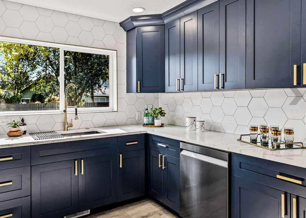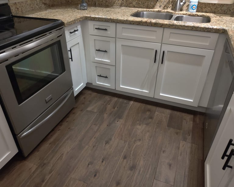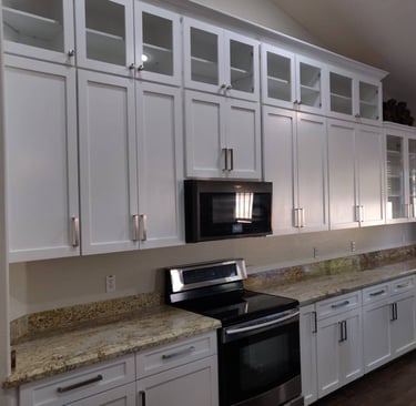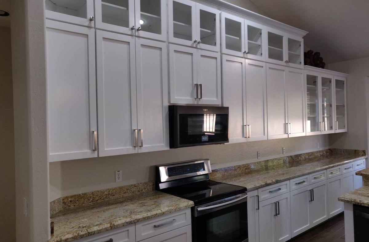 Tired of outdated cabinets but don’t want the hassle of a full remodel? Our cabinet refacing with painted shaker doors is the perfect solution!